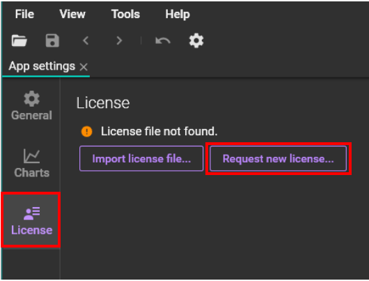Click [License] on the left side, then click [REQUEST NEW LICENSE...].