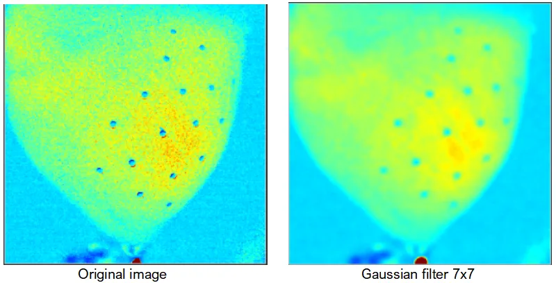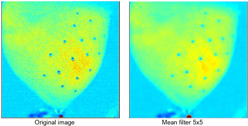 If "Kernel" is 3, the average of 9 (=3x3) pixels is set to the center pixel. If Kernel is 5, the average of 25 (=5x5) pixels is set to the center pixel.