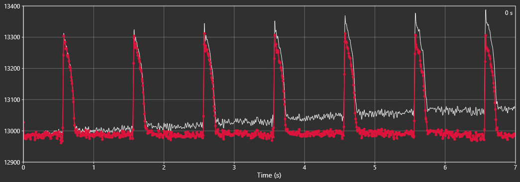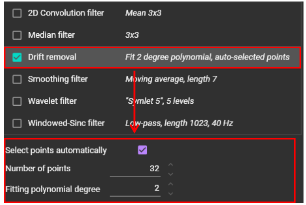 - Set "Select points automatically", "Numer of points" and "Fitting polynomial dgree". When you change values, waveform after "drift removal" processing is automatically displayed in red.