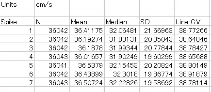 Displays the average CV values for each spike (action potential or Ca2+ transient) along the path (line or polyline).