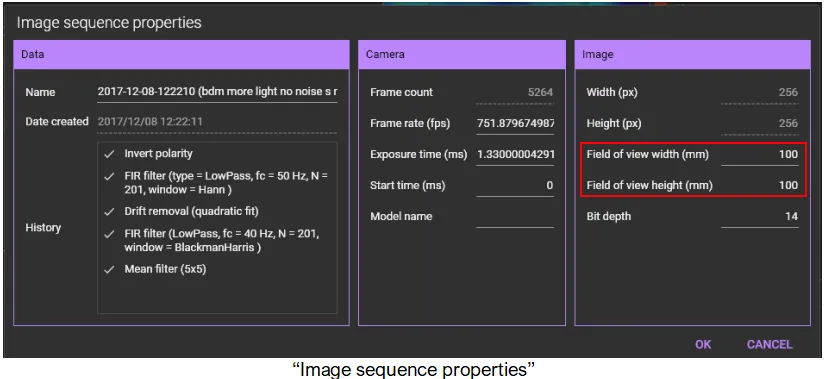 If “Field of view width (mm) / Field of view height (mm)” are already set on the “Image sequence properties” that opens when you right-click an image and select “Property”, pixel size is displayed in this area.