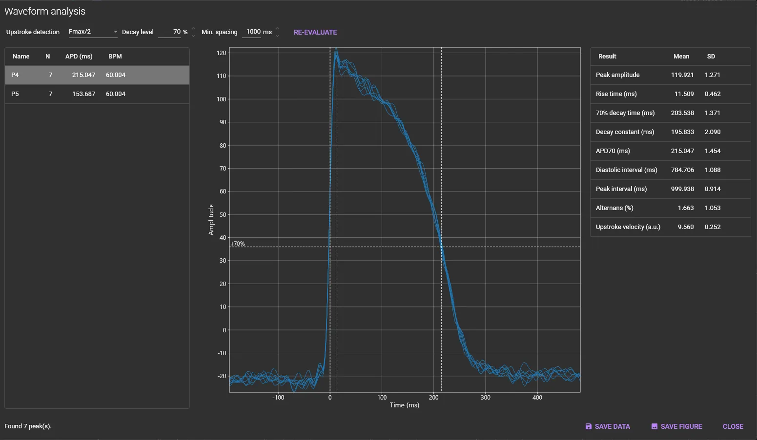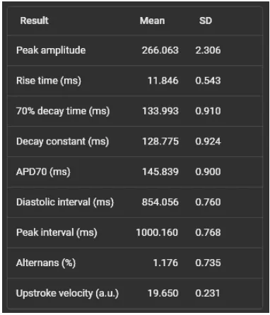 Outputs peak amplitudes, peak time, rise time, xx% decay time, decay constant, APDxx, diastolic interval, peak interval, alternans and upstroke velosity at selected points to a CSV file. Outputs values for each peak (not an average) at a selected point.