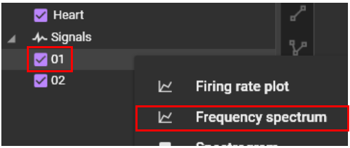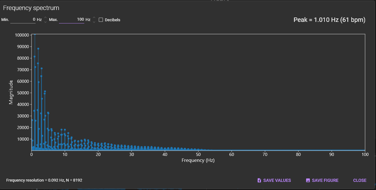 Displays frequency analysis results using FFT (X-axis: frequency (Hz), Y-axis: magnitude or decibels).